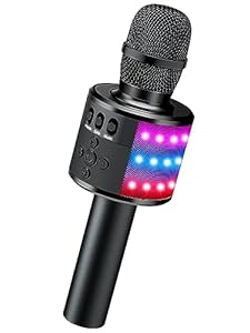 Elevate your karaoke game with the BONAOK Bluetooth Wireless Karaoke Microphone. This 4-in-1 microphone not only lets you sing your heart out, but also doubles as a portable Bluetooth speaker and MP3 player. Packed with 27 colorful LED lights that dance to the rhythm of the music, this microphone creates the ultimate karaoke atmosphere. Long press the 'M' button to control the LED lights, and make your performance even more captivating.